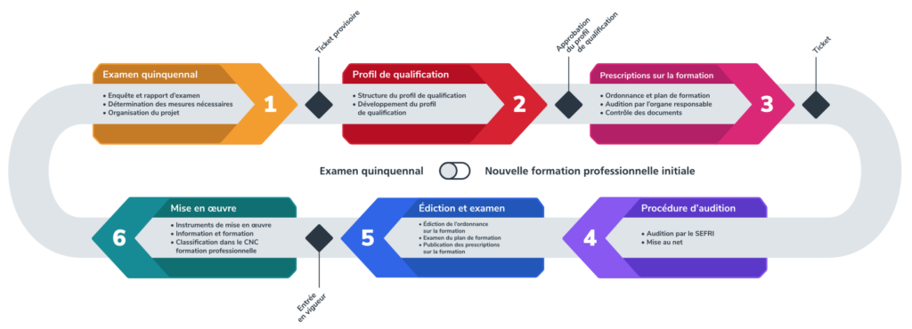 Avant leur entrée en vigueur, les nouvelles prescriptions sur la formation feront l’objet d’une large consultation, les retours seront évalués avec les partenaires associés et intégrés dans les documents finaux. Cela garantit que les nouvelles dispositions soient largement soutenues et adaptées à la pratique.